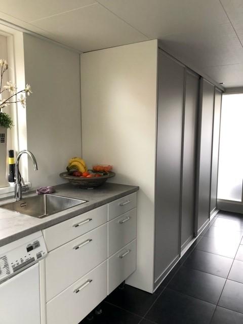 Kan jouw schuifwand niet tegen een vaste wand geïnstalleerd worden? Dan kun je een zijpaneel toevoegen. Anders schuift de schuifwand namelijk uit de rails. Houd wel even extra rekening met het noteren van de maten als je een zijpaneel toevoegt. Noteer in dit geval de inbouwmaat inclusief dikte van één of twee zijpanelen (18 mm per paneel). Zijpanelen komen in een standaardhoogte van 2800 mm en kunnen mogelijk ingekort worden om bij je ruimte te passen. Daarnaast kun je kiezen uit twee dieptes, namelijk: 680 mm of 800 mm. Heb je graag wat meer informatie hierover? Neem dan gerust contact op met onze experts.