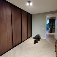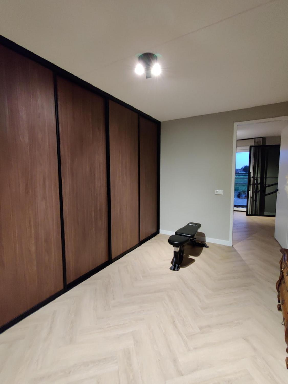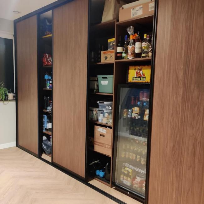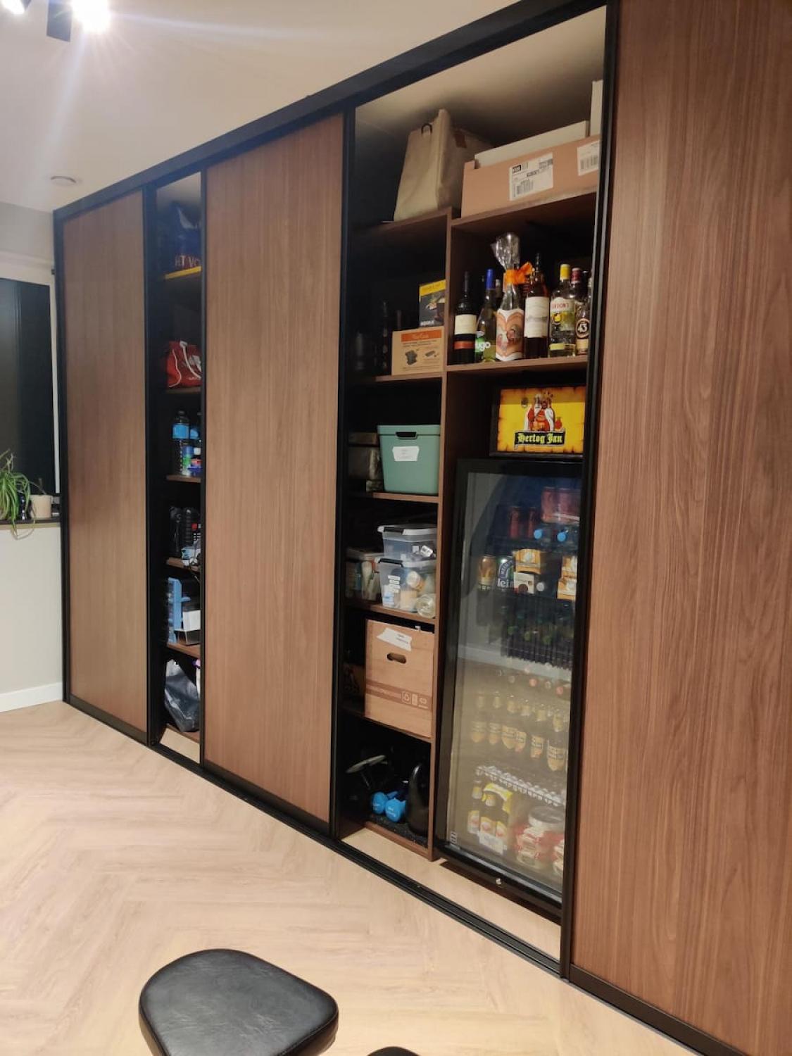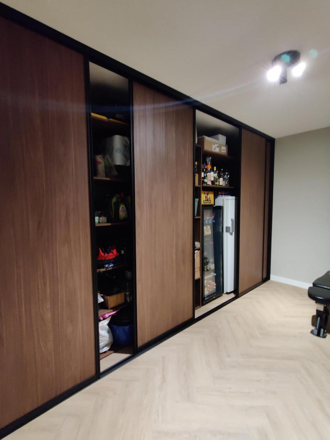 Deze 5-deurs schuifwand uitgevoerd in materiaal M246 Lincoln Notelaar, een elegante houtlook, met een zwarte omlijsting is een echte eyecatcher in de ruimte. Een schoolvoorbeeld van functionele opbergruimte met een prachtige natuurlijke uitstraling.