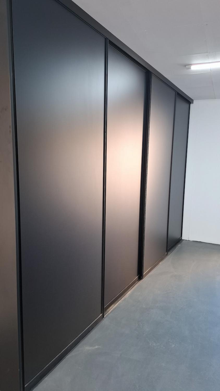 Deze vierdeurs schuifwandkast combineert een moderne uitstraling met een strak design. De matzwarte panelen, het zwarte profiel en de bijpassende rails zorgen voor een elegante afwerking.