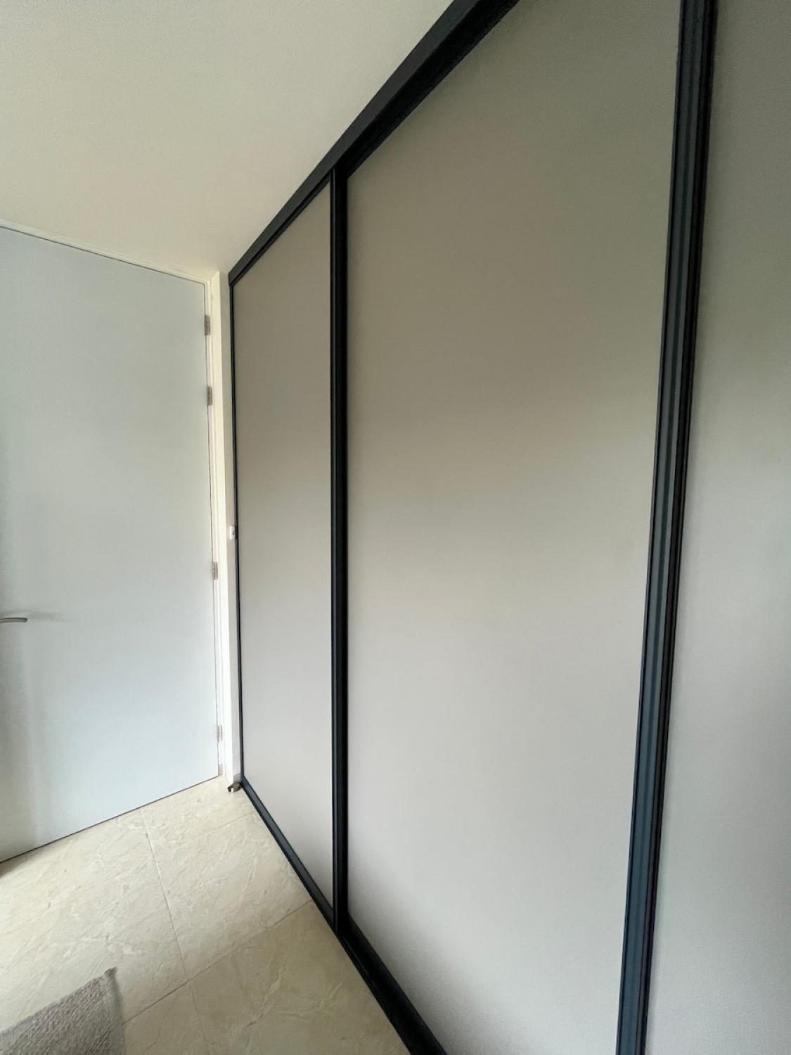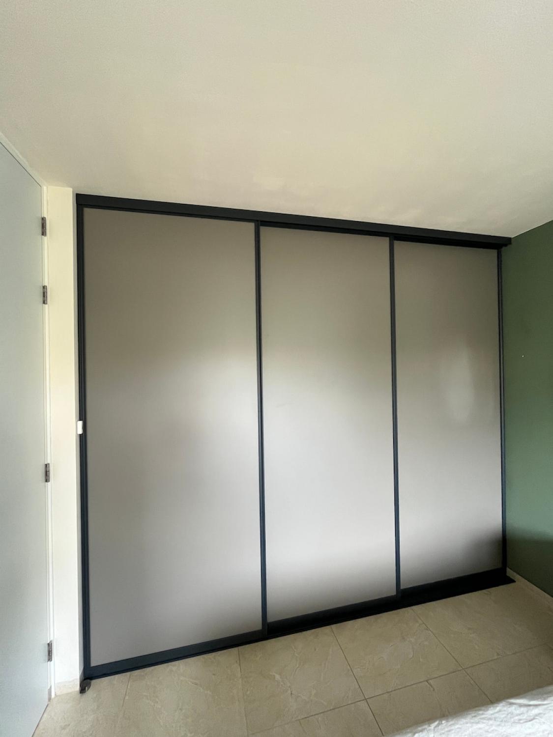 Deze donker taupe schuifwand met 3 deuren en antraciet profiel past prachtig in dit moderne interieur. Is deze kleur ook perfect voor jouw woning?