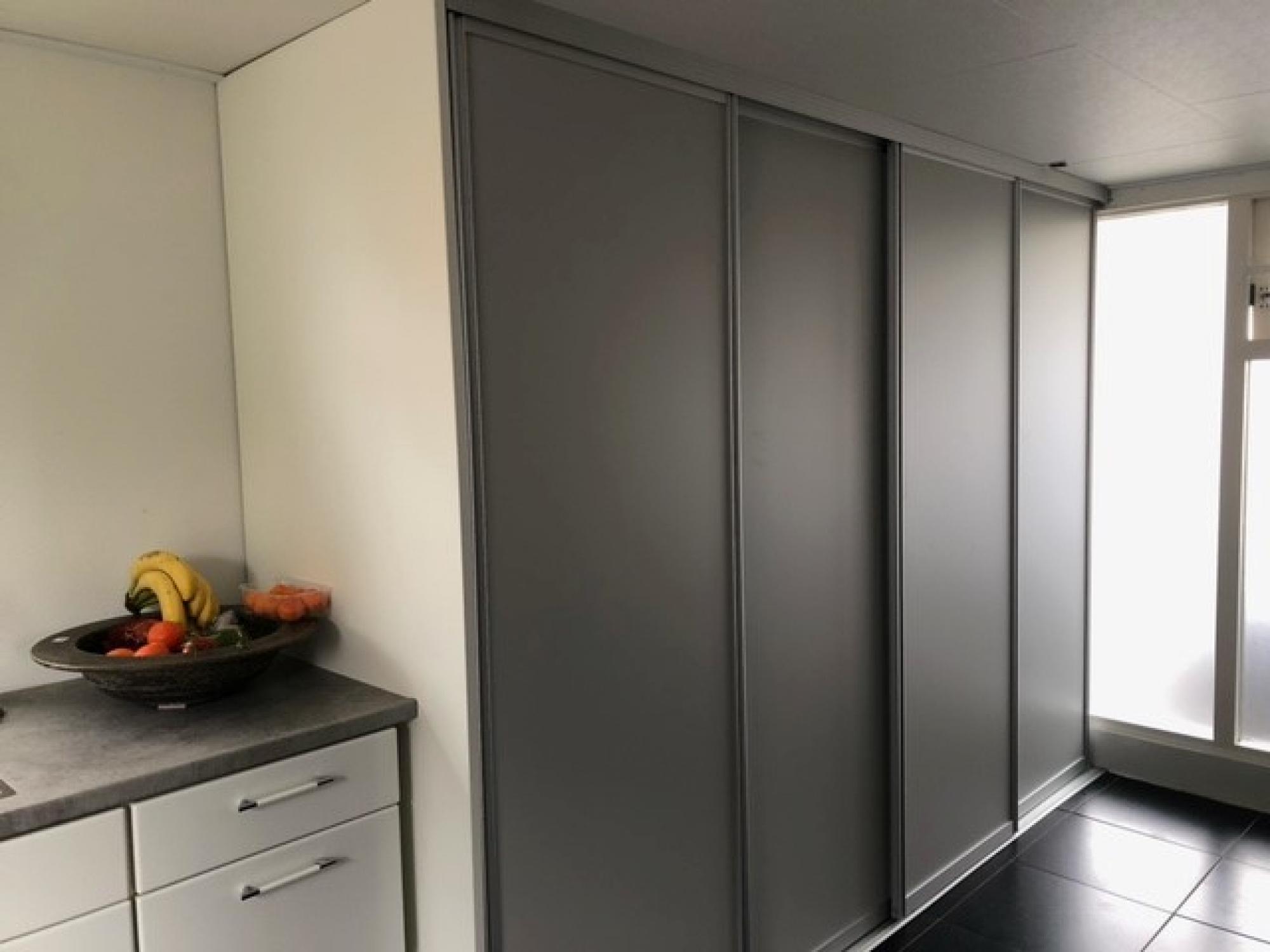 Deze schuifwandkast met vier uni lichtgrijze deuren, een aluminium profiel en wit zijpaneel is het toonbeeld van moderne elegant. Deze schuifwandkast combineert efficiƫnt opbergruimte met een strakke uitstraling, waardoor het een ideale toevoeging is voor een stijlvolle en georganiseerde leefruimte.